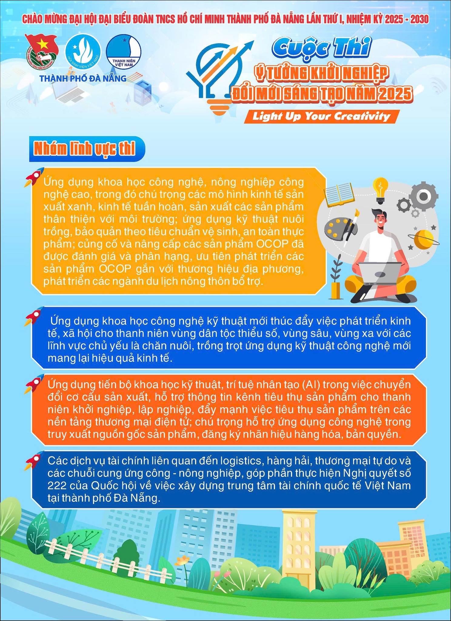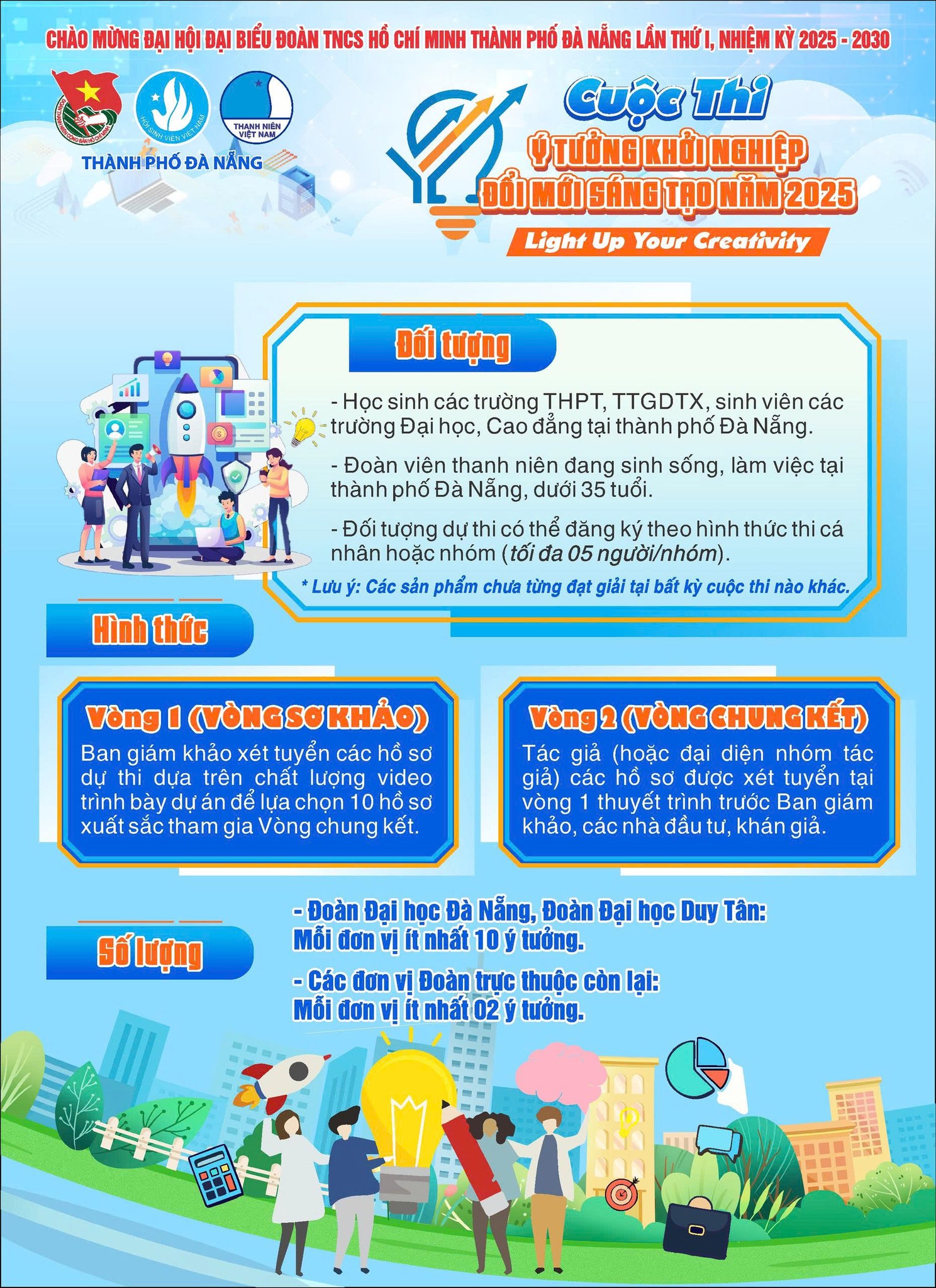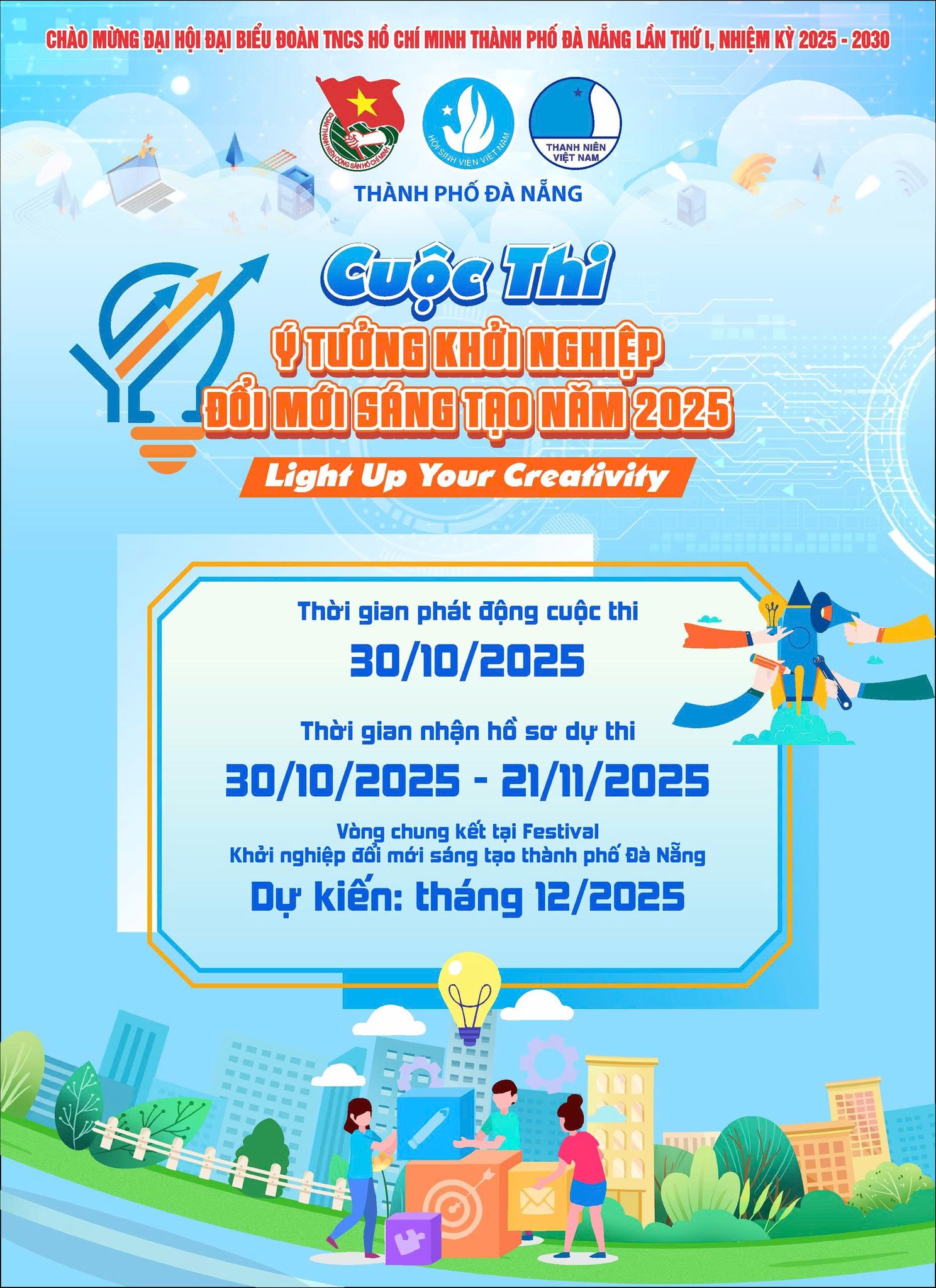 Các bạn Đoàn viên, Thanh niên, Học sinh, Sinh viên ơi, đã đến lúc thắp sáng ý tưởng và biến đam mê thành hiện thực. Bạn có một ý tưởng đột phá, một dự án khởi nghiệp sáng tạo, Cuộc thi "Ý tưởng khởi nghiệp đổi mới sáng tạo - Light Up Your Creativity" năm 2025 chính là sân chơi dành cho bạn!